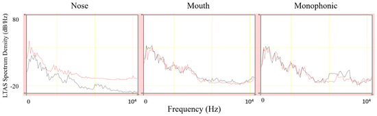 To facilitate the interpretation of these results, Figure 6 illustrates how the spectra of nasal and oral vowels vary as a function of the recording device. Note that in the case of the nose signal, the nasal (red) line is above the oral line all along the spectrum. In contrast, in the case of the mouth and monophonic signals, the two lines are very close to each other.