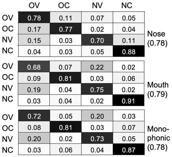 Next, we computed the confusion matrices for each model using four categories (NV, NC, OV, OC). The 10 confusion matrices of each condition were averaged to obtain three confusion matrices (for mouth, nose, and monophonic signals). These confusion matrices were used to examine the accuracy and the error biases. The three following measures were used for examining the accuracy: (1) by considering the four phonetic classes (NV, NC, OV, OC); (2) by considering the superclasses oral and nasal; and (3) by considering the superclasses vowel and consonant. As for the error biases, it is relevant that hypernasality assessment tests typically use oral sounds and count the number of nasalization errors; this means a relatively small number of false positives (i.e., items that are wrongly classified as nasal) may lead to wrong results, and in contrast, if false negatives represent a small percentage, the impact might be small. Accordingly, special attention was paid to the percentage of frames wrongly classified as nasal.