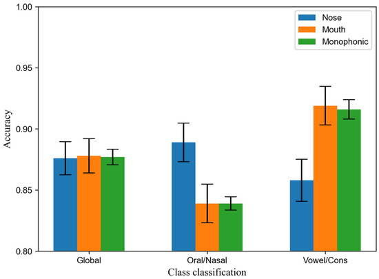 Figure 8 summarizes the accuracy when considering the four classes and when considering only two of them (oral versus nasal or consonant versus vowel). When the four classes are considered, the accuracy is almost identical in all three conditions. However, with just two classes, the error patterns are not the same: for the oral/nasal class, the accuracy is higher in the nose condition than in the other two; while for the vowel/consonant class, the accuracy is higher in the mouth and monophonic conditions than in the nose condition.