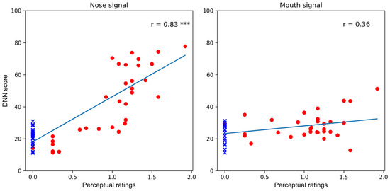 Pearson correlation between perceptual ratings and DNN scores computed with nose (left) and mouth (right) signals (***: Nose signal has the correlation r = 0.83 with p < 0.00001). Blue crosses: healthy children. Red dots: hypernasal patients.