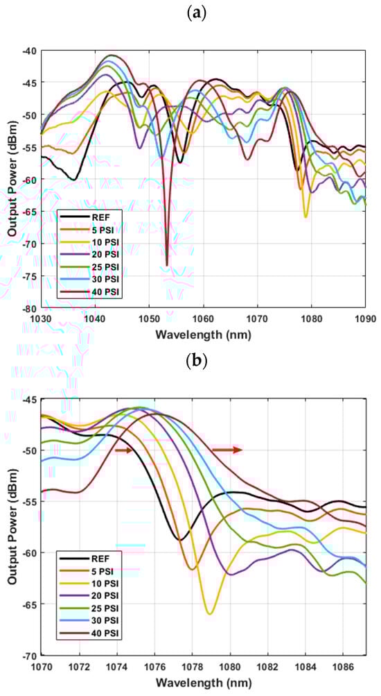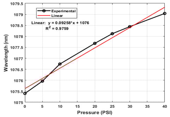 Figure 5 represents the change in wavelength of the signal obtained from the ASE noise of the ytterbium-doped fiber by increasing the pressure inside the cell where the TCMFI is located. The graph in Figure 4b was obtained with a constant power output (approx. −50 dBm) for pressure values of 0, 5, 10, 20, 25, 30, and 40 PSI; an approximate redshift of 3.5 nm is observed from the minimum to the maximum air pressure. As a result, the TCMFI exhibits a sensitivity of 0.0925 nm/PSI in the 0–40 PSI range.