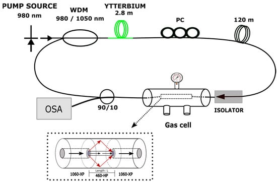 The scheme in Figure 3 was implemented to study the pressure response of the TCFMI. This setup employed a QPHOTONICS QDFBLD-980-350 (Ann Arbor, MI, USA) semiconductor laser diode inside a Thorlabs CLD1015 controller as our pump source, followed by a WDM, which is a wave division multiplexer; as an active medium, we used ytterbium-doped fiber (Thorlabs YB1200, Newton, NJ, USA), with a length of 2.8 m, a core diameter close to 10 μm, and a high concentration of nearly 9 × 1019 ions/cm−3, which worked at the same wavelength as the pumping source. Afterward, a polarization controller was set to manipulate the polarization stage; moreover, an optical fiber isolator was used to avoid feedback from the system; between these elements, 120 m of 1064 nm single-mode fiber was set. Finally, the gas cell contained the interferometer interacting with the pressure inside it, thus changing the output interference pattern; the fiber laser system response was analyzed and visualized using an optical spectrum analyzer (OSA), YOKOGAWA AQ6370B (Tokyo, Japan). This setup was the base of the pressure ring fiber laser cavity.