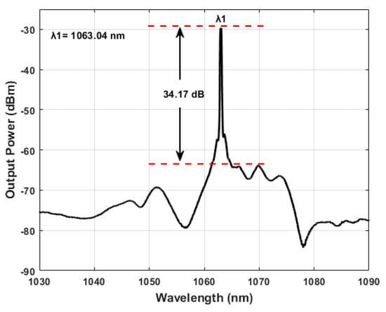 The response of the laser is demonstrated in Figure 7. A single-line emission was generated at 1063.04 nm for the initial conditions with a side mode suppression ratio (SMSR) of 34.17 dB. These results of emissions, as well as all the results shown in the manuscript, were recorded using an OSA resolution of 0.2 nm.