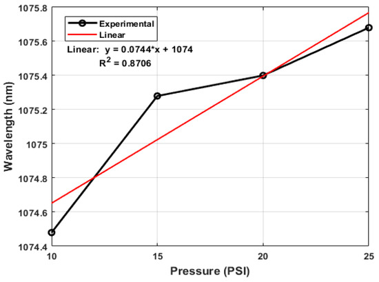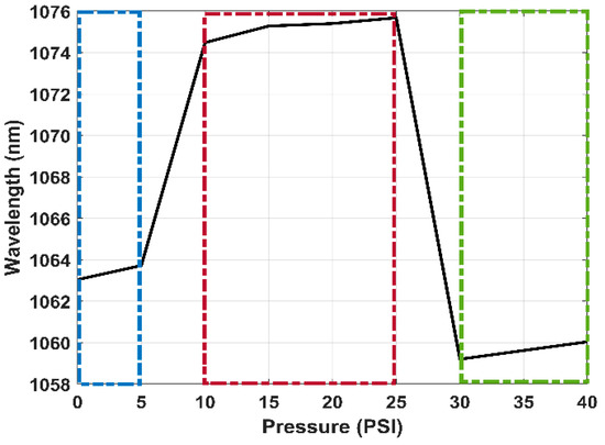 As shown in Figure 9, a switchable fiber laser response is observed within a specific range. In the area delimited in blue, as the pressure increases from 0 to 5 PSI, it shifts 0.68 nm upon reaching 10 PSI; in the region of red color, represented in Figure 10, the relationship between the pressure and the laser wavelength presents a certain linearity. As the pressure increases, the wavelength of the laser emission shifts toward wavelengths in the red region. A sensitivity of 0.0744 nm/PSI in the range of 10–25 PSI with a step of 5 PSI is achieved for the laser. The switching occurs at a pressure of 30 PSI, as seen in the green region.