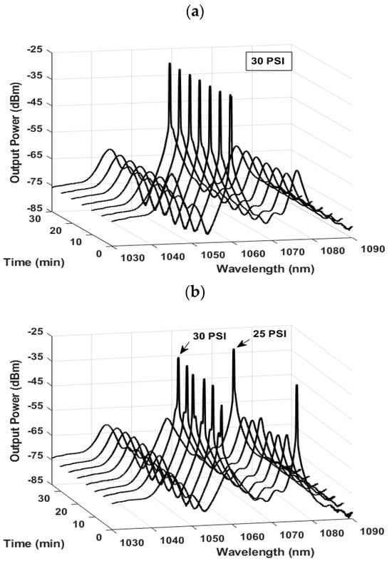 Maintaining a constant pressure of 30 PSI inside the cell, the output spectrum was scanned for 30 min and recorded after 5 min intervals (see Figure 11a) with a resolution of 0.2 nm. This experimentation was conducted at ambient room temperature to confirm the laser’s operational stability. Furthermore, it allowed for the examination of alterations in laser emissions when transitioning pressure between 25 and 30 PSI, and vice versa, over 30 min. Notably, it was observed that the laser emission reverted to 1075.68 nm (as shown in Figure 11b).