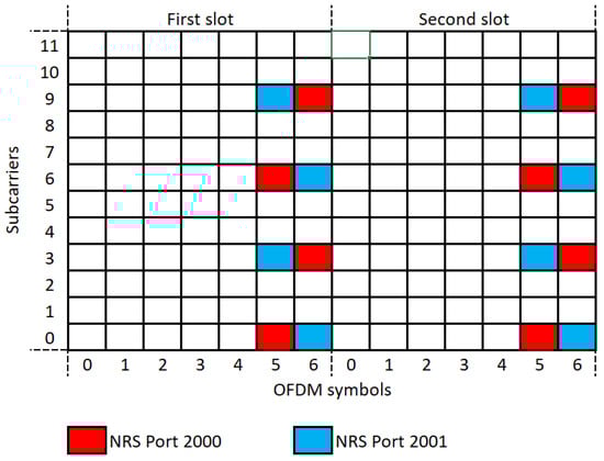 Similar to LTE, the NB-IoT downlink physical layer is based on the OFDM transmission scheme []. A reference signal is transmitted in resource elements at specific subcarriers and symbols. The NB-IoT physical layer, designed to allow for coexistence with LTE transmissions, uses a single physical resource block (PRB) of 180 kHz []. For downlink transmission, 12 OFDM subcarriers are available, separated by 15 kHz. In the time domain, the downlink is organized into 10 ms frames. Each frame consists of 10 subframes divided into 2 slots, each carrying 7 OFDM symbols [,]. A dedicated reference signal, called Narrowband Reference Signal (NRS), is introduced in the NB-IoT downlink. NRS is a pseudorandom sequence of complex numbers mapped onto QPSK constellation points. Real and imaginary parts of these numbers correspond to even and odd elements of a -bit long Gold sequence. An NRS is assigned four resource elements located in the last two symbols of each NB-IoT subframe slot. If the eNodeB (eNB) base station uses two antenna ports for NB-IoT transmit diversity, each of these ports is assigned an NRS with a different resource allocation. The four NRS subcarrier indices are dependent on the NB-IoT cell identifier (NB cell ID) according to []. An NRS is not transmitted in subframes reserved for synchronization signals (NPSS and NSSS). Figure 1 presents the possible allocation of NRS resources in a single subframe.