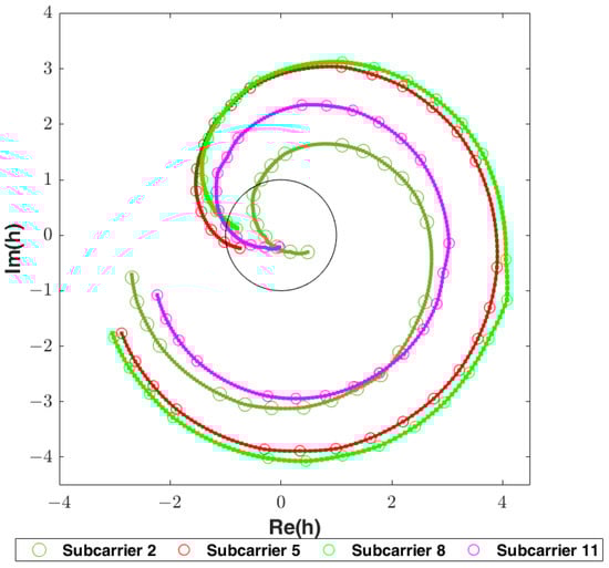 Normally the ranges between 0 and 1. The higher value reflects more accurate symbol reception, whereas negative values would indicate the rotation between the received and reference symbol constellation. To provide a view on the relationship between and the accuracy of the received symbols, a few example constellation graphs are presented in Figure 4. For lower cases, some symbol points are not visible on the graph due to axes limitations introduced to keep equal scales of all the subplots. These graphs were obtained for the proposed channel estimation method, in the additive white Gaussian noise (AWGN) channel at SNR values of −5 dB, 0 dB, 5 dB, and 10 dB, respectively.