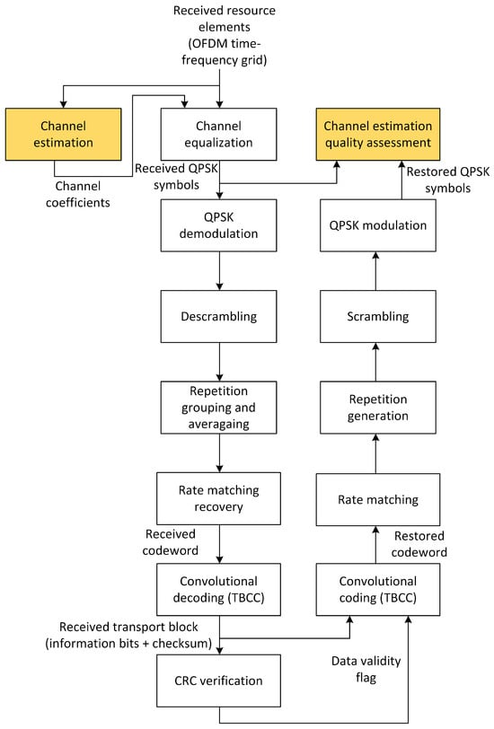 Full downlink physical layer processing is implemented, starting from time-frequency synchronization and OFDM FFT demodulation (not included in Figure 3) to channel decoding and transport block recovery. If the transport block is received correctly, which is verified by CRC check, its bits are again channel encoded and processed further until a set of reference QPSK symbols is obtained with the values from the original QPSK constellation, i.e., .