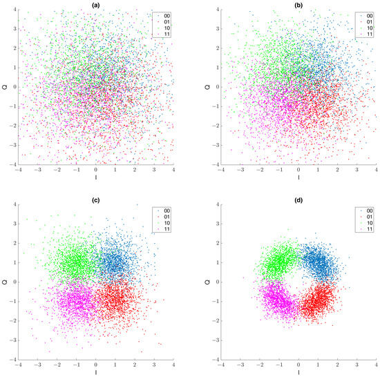 Received symbols represented as points on IQ plane for different values of symbol accuracy coefficient: (a) = 0.45, (b) = 0.809, (c) = 0.966, (d) = 0.993.