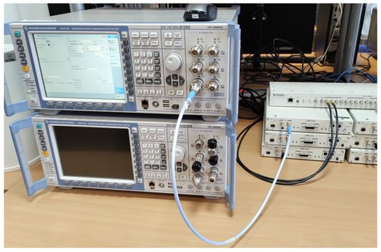 To evaluate the performance of the proposed channel estimation method, a series of test waveforms were captured and processed. An R&S® CMW500 radio communication tester [] was used as an NB-IoT downlink signal source, as shown in Figure 5. Test signals were generated for 2 channel types: AWGN (without multipath fading) and EPA 5 Hz (EPA multipath profile with 5Hz maximum Doppler shift). For both channel types, 4 SNR values were considered: −5 dB, 0 dB, 5 dB and 10 dB. The radio tester was connected to the Ettus Research USRP X310 software defined radio platform, which was used to capture the waveforms of the test signals. For every [channel type, SNR] pair, a series of waveforms was recorded. They were further passed through a dedicated software-defined NB-IoT UE receive path developed in MATLAB environment.