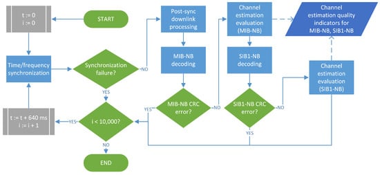 The algorithm for processing waveform files is shown in Figure 6. Each iteration starts with the frequency and time synchronization step which also provides information about NB cell ID and frame number modulo 8. The synchronization is considered successful if the decoded NB cell ID matches the one set in the tester and the absolute frequency shift does not exceed 1 kHz. Once the waveform is properly aligned in time and frequency, further processing steps are conducted, with a view to decode the Master Information Block (MIB-NB) whose transmission is repeated every 64 frames. If MIB-NB reception is successful, i.e., CRC verification is passed, the block is decoded in order to extract the information necessary to retrieve the subsequent System Information Block Type 1 (SIB1-NB). Receiving SIB1-NB requires processing 256 consecutive frames. If MIB-NB and SIB1-NB are both decoded successfully, bits of their transport blocks are used to calculate channel estimation quality indicators, according to the procedure shown in Figure 3.