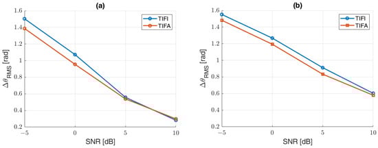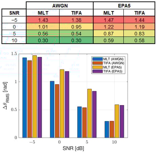 Channel estimation performance indicators were evaluated for both approaches, and the results are presented in Figure 7 and Figure 8. As can be seen, frequency averaging, despite providing only one coefficient per OFDM symbol, performs better for both AWGN and EPA channel profiles. The improvement is particularly noticeable for low SNR conditions in the AWGN channel where TIFA demonstrates significantly lower phase RMSE and a higher symbol correlation coefficient. In the fading channel, TIFA performs better in terms of phase SNR. The performance expressed by symbol correlation is similar for TIFI and TIFA.