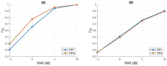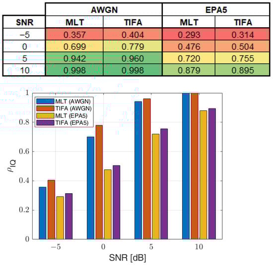 Figure 9 and Figure 10 show the results of SNR performance comparison between MLT and TIFA. As expected, both methods perform better in the AWGN scenario than in the fading channel scenario. It may be observed that, for all the considered SNR values and channel profiles, TIFA provides lower phase RMS error than the estimation method from MATLAB LTE ToolboxTM. Error reduction is approximately 3% on average. The advantage of TIFA over MLT is especially visible for low SNR values. The same applies to symbol correlation represented by . In the AWGN scenario, as SNR increases approaches 1.0 value, which corresponds to a perfect match between equalized and original symbols. The average difference in between TIFA and MLT is approximately 5–6%.