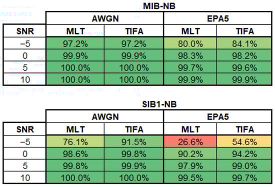 In addition to channel estimation quality indicators, the percentage of successfully decoded information blocks, MIB-NB and SIB1-NB, was evaluated. The results are presented in Figure 11. For MIB-NB, the results for MLT and TIFA are very similar, except the case of the EPA profile with −5 dB SNR, where TIFA outperforms MLT by 4%. The difference between the two methods is more distinct in the case of SIB1-NB decoding. Especially for low SNR, a significant advantage of TIFA is observed. The number of decoded SIBs doubled when TIFA was applied to the EPA channel at −5 dB SNR. In general, the percentage of successfully decoded MIBs is higher than that of SIBs due to smaller transmission redundancy of the latter. For MIB-NB in standalone operation mode, 128 OFDM resource elements are used per one bit of transport block, while for SIB1-NB this ratio is approximately 99 resource elements per bit in the analyzed transmission scheme.