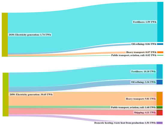 According to [63], the peak consumption of electricity in Lithuania is predicted to reach 13.7 TWh by 2030 (1.9% annual rise on average). Local electricity production is set to increase to 7 TWh in 2030, of which 45% will be produced from renewable sources like wind energy (53% or 3.71 TWh) and solar energy (22% or 1.54 TWh) [56,57,58]. This would fully cover the expected amount of renewable electricity needed for water electrolysis to produce green hydrogen: 20,000 tonnes of hydrogen or 1 TWh of electricity prediction is given in [49] and 1.74 TWh is stated in the guidelines for the development of the hydrogen sector [23]. Moreover, Lithuania’s electricity production in 2050 is set to increase to 18 TWh, which will consist of 100% renewable energy. A feasibility study [49] predicts that 6.3–16 TWh of electricity will be required for green hydrogen production alone (225,000 t of hydrogen in various forms). The guidelines [64] foresee that the required amount of electricity for green hydrogen may be even bigger and may reach up to 30.65 TWh, with the largest demand coming from fertilisers and the heavy transport sector (Figure 2).