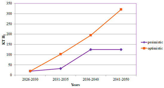The first commercial power-to-gas project is being implemented in Lithuania; it began in 2021 and is expected to start producing green hydrogen in 2024. The innovation agency predicts [58] that Lithuania’s industry could produce around 20 KT of green hydrogen in the period of 2026–2030 and could gradually increase this amount to 125–320 KT H2 between 2041–2050 (Figure 3).