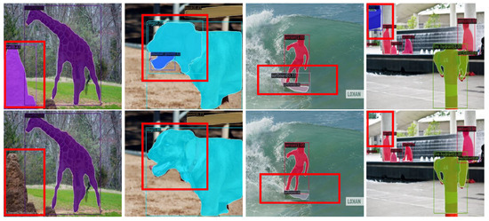 Example pairs of instance segmentation results. (Top row) The results are from Mask R-CNN with FPN. (Bottom row) our MSBA method significantly enhances the instance classification performance and effectively mitigates duplicate bounding boxes within densely populated regions, as demonstrated qualitatively.