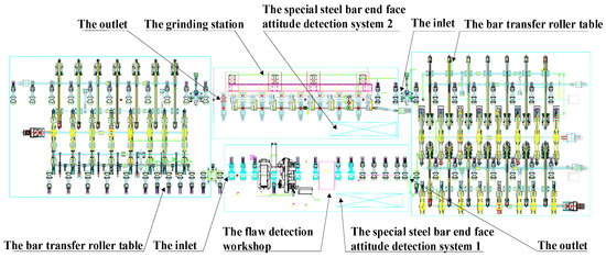 Layout of the flaw detection workshop and grinding station in the special steel bar production line.