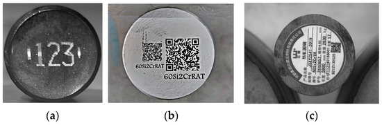 In order to calculate the end face attitude of special steel bars, the characteristics of the steel bars’ end faces must be determined first. As a first consideration, the end face’s texture should be considered. The texture features can be used to extract defects [16] and perform identification [17]. However, the collection of texture features requires high-definition acquisition equipment, and the light requirements are high, which is difficult to implement on a steel bar production line. Therefore, it is pertinent to consider the features added by human factors based on the actual production site situation. It is understood that different enterprises have different treatment processes for the steel bars’ end faces. Some companies mark the bar ID by spraying the code [18,19,20] on the end of the bar while others mark the bar ID by spraying or sticking a two-dimensional code on it. According to Figure 2, the end face features of the three cases are mainly numbers, text, two-dimensional codes, and some regular shapes. For the purpose of representing the rotation attitude of a bar’s end face in a way that is more intuitive and making the angle of the steel bar’s end face correspond to the rotation angle of the bar, we selected the center of the circumscribed circle of the bar’s end face and a feature point outside the center to determine the angle of the rotation attitude. Additionally, another feature point can be the end point of a number, text, or QR code, which can be selected based on the actual situation on site. The feature in Figure 2c is selected for investigation, which is the steel bar’s end face feature on the production line of the HBIS GROUP SHISTEEL COMPANY, so it is more practical to study such a feature.