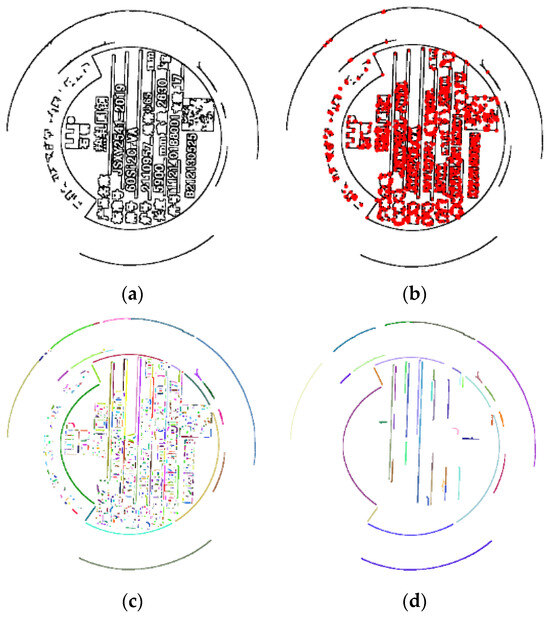 The edge image is relatively complex from the edge image in Figure 3a, and the arc of the circle to be detected is often connected to or intersected with the background or arcs of other circles. When circle parameters are calculated directly, not only is the calculation large, but also the accuracy cannot be guaranteed. In order to detect the circle more accurately, the Harris corner detection method is used to detect the position of the corner point, and the detection result is shown in Figure 3b. Then, the position of the corner point is corroded, resulting in a complete disconnect between the intersection point and the position of the broken line in the original image. Then, the marking matrix is obtained by using the 8-neighborhood connected region marking method as shown in Figure 3c. Smaller connected regions are removed according to a threshold, and a new marking matrix is obtained as shown in Figure 3d.
