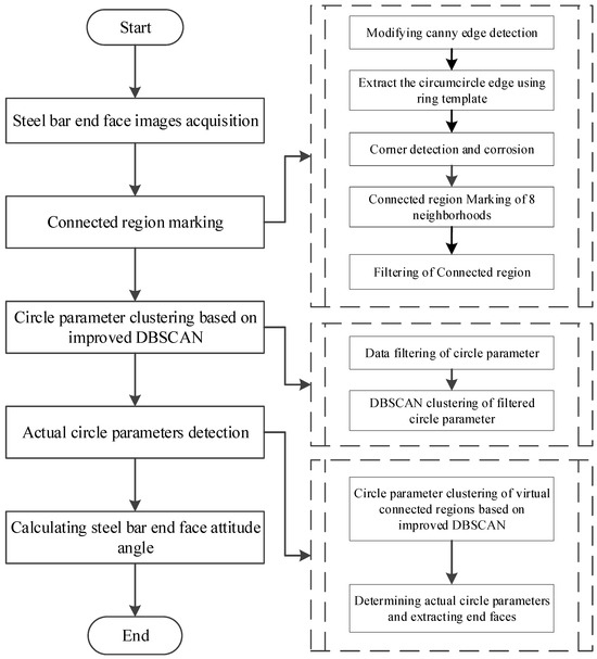 As previously mentioned, the bar end face attitude is determined primarily by two feature points. Since the two-dimensional code has a more mature identification and positioning method, the accuracy of the bar end face attitude angle is primarily determined by the accuracy of the center of a steel bar’s end face. For illustrating our detection algorithm, we use the algorithm flow chart shown in Figure 4 to illustrate its implementation. The flow chart not only illustrates the detection process of the steel’s end face attitude, but also the key steps involved in its implementation. The detection process mainly includes the following steps: steel bar end face image acquisition, connected region marking, circle parameter clustering based on improved DBSCAN, actual circle parameter detection, and calculating steel bar end face attitude angles. The specific implementation is as follows.