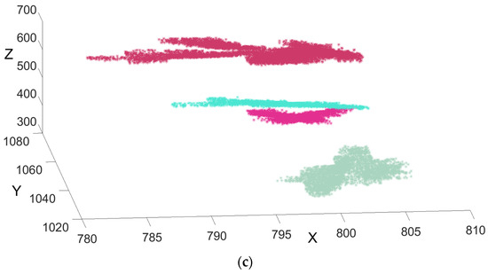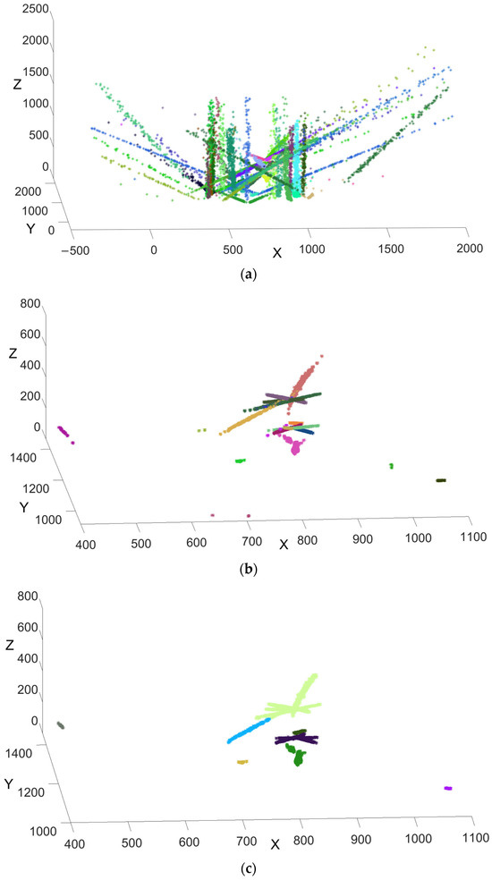 Figure 6b shows the circle parameters of virtual connected regions. Different colors in Figure 6b indicate that the data come from different virtual connected regions. Compared with Figure 5a, the circle parameters of virtual connected regions are denser, and the amount of discrete circle parameters is significantly less, which also shows that after the first clustering, the connected regions belonging to the circle are basically preserved, and the connected regions which are quite different from the circle are deleted. The improved DBSCAN is performed according to Section 3.2, and a final clustering result is obtained as shown in Figure 6c. The same color data in Figure 6c indicate that they belong to the same clustering result. The circle parameters are concentrated in four unrelated regions, which represent the four circles on the steel bar’s end face in Figure 2c.