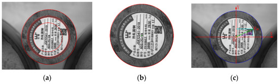 The circle detection results are shown in Figure 7a, in which the red part represents the circle detection results. It can be seen from the results that all circles in the steel bar’s end face image were accurately detected. Among all circles, the circumcircle of the steel bar is the largest. Therefore, the largest circle is retained, which means that the steel bar’s end face was completely located, as shown in Figure 7b.