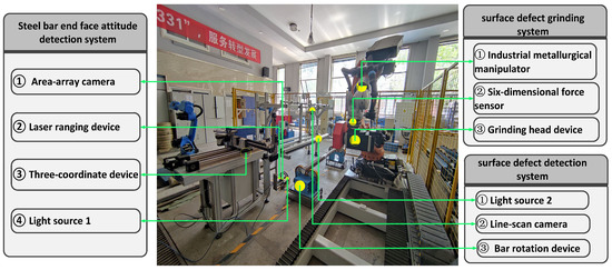 At present, steel bar surface defect detection methods include the eddy current detection method [1,2,3], the magnetic flux leakage detection method [4,5,6], the laser ultrasonic detection method [7,8,9], the infrared imaging detection method [10,11,12], the machine vision detection method [13,14,15], and so on. These detection methods, however, focus only on the presence of defects on the surface of the steel bar. And they do not consider the problem that the defect needs to be repositioned after the bar leaves the detection instrument. But to accomplish automatic surface defect grinding, off-line traceable surface defect location information must be obtained. The existing steel bar surface defect detection instruments can obtain axial and circumferential position information of the surface defect when the bar is placed in the detection instrument. The axial position is represented by the length from the end of a steel bar, whereas a circumferential position is generally expressed by the counterclockwise expansion angle of the random reference zero position. Once the steel bar leaves the detection instrument, the circumferential position is impossible to locate again due to using a random reference zero position. Consequently, the special steel bar end face attitude detection system 1 was installed in the flaw detection workshop as shown in Figure 1. The rotation attitude of the end face during defect detection is calculated based on the characteristics of the steel bars’ end face. By recording the rotation attitude, the circumferential position of defect detection has an absolute reference zero position. At this moment, once the special steel bar end face attitude detection system 2 has also been installed at the position of the grinding platform, the surface defect location can be re-located for use in the steel bar automatic grinding system.