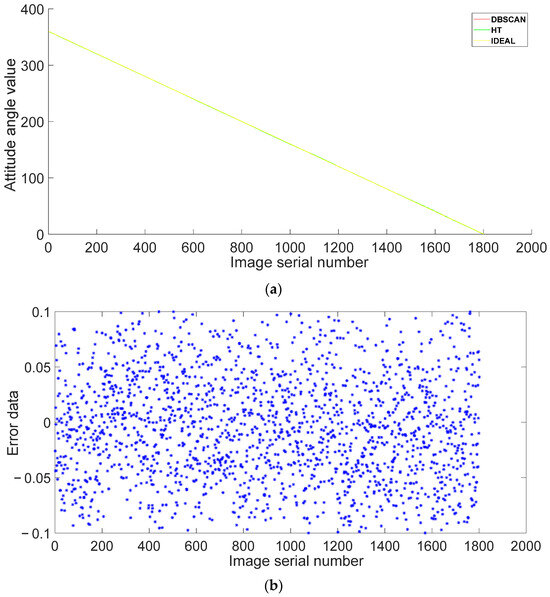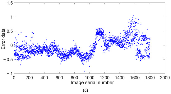 The experiment device captured more than 1800 images of the steel bar’s end face. The attitude angle value of each image is calculated using the method in this paper. At the same time, the commonly used Hough circle detection (HT) method is employed to extract the circumscribed circle parameters, and the attitude angle value of each image is also calculated. Figure 9a is a comparison curve between the attitude angle value calculated using our method or HT method, and the ideal data. The yellow line represents the ideal curve with an equal interval of 0.2 degrees, the green line represents the attitude angle curve calculated using the HT method, and the red line represents the attitude angle curve calculated using our method. Due to the ideal curve covering the other curves, the yellow line and green line can be seen more clearly on attitude angle curves, whereas the red line is only visible in a few places, which indicates that the calculation results for this paper are closer to the ideal value than for the HT method. For further quantitative evaluation of the accuracy of the two methods, the difference between attitude angle calculated using our method and the ideal value was compared to the difference between attitude angle calculated using the HT method and the ideal value. The results are shown in Figure 9b,c. From Figure 9b, we can see that the error range between the attitude angle value calculated using our method and the ideal attitude angle value is within 0.1 degrees. But in Figure 9c, the error range between the attitude angle value calculated using the HT method and the ideal angle value is within 1.1 degrees. According to the distribution of error data, the distribution of the error data of the method in this paper is relatively uniform. In contrast, the distribution of the error data of the HT method is messy. In addition, the error data of the HT method are not centered at 0, the first half is biased towards data below zero, while the second half is skewed towards data in excess of zero, and there is no specific rule to follow. As can be seen from the results in this paper, the method presented in this paper performs significantly better than the HT detection method.