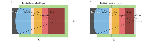 Figure 1 illustrates a two-dimensional axisymmetric simulation model developed using COMSOL V6.1. Figure 1a represents biological tissues alone, while Figure 1b incorporates infrared glass. A focused ultrasound transducer with parameters, shown in Table 1, was used. The excitation signal was a sine wave with a frequency of 1 MHz. Multiple layers of human tissue, including skin, fat, muscle, and liver, were used with ultrasound beams focused 42 mm deep into the liver. The specific biological tissue parameters used in the model are shown in Table 2.