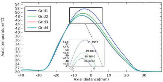 Figure 2 shows that the temperature distribution waveforms of different grid size models are roughly the same, with some errors in the highest temperature. The maximum axial temperature values of Grid1, Grid2, Grid3, and Grid4 are 51.7997, 49.4845, 48.4640, and 48.4003, respectively. The maximum error between Grid1 and Grid4 is 3%, while the maximum error between Grid3 and Grid4 is only 0.1%. Based on the temperature distribution curve results in this model, a maximum unit size of the grid at 0.2463 mm renders the numerical solution reliable. At this point, further grid refinement leads to marginal alterations in the solution accuracy. Considering the overall solution accuracy and calculation time, the grids for the models under different working conditions are segmented into six units per wavelength.
