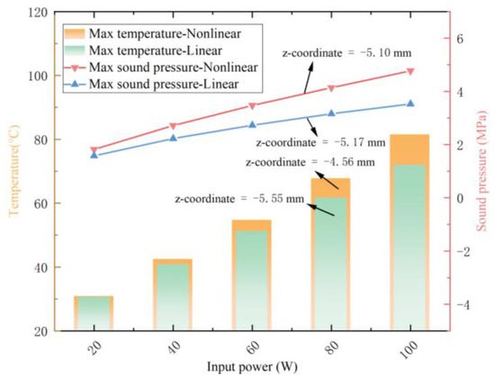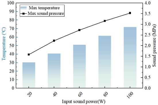As shown in Figure 3, there is a linear relationship between the sound power and peak ultrasound pressure. As the power linearly increases, the peak ultrasound pressure and maximum temperature increase. The larger the power difference, the more pronounced this trend becomes.