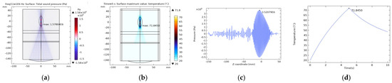 The simulated sound and thermal field distributions that occur when the sound power is 100 W are shown in Figure 4. Figure 4a depicts the ultrasound field distribution of the ultrasound, showcasing an elliptical region within the −6 dB focal zone. Furthermore, Figure 4c illustrates the ultrasound pressure distribution along the sound axis, offering a deeper understanding of the intensity and shape of the ultrasound waves at various positions. In theory, the focus should be on the origin of the coordinate, and the maximum ultrasound pressure should coincide with it. However, the simulation results showed that the actual peak ultrasound pressure occurred at the coordinate −5.17 mm, indicating a 5.17 mm offset, which is independent of the power. When the HIFU penetrates multiple layers of tissue, the propagation path of the ultrasound waves is bent due to factors such as absorption and scattering, which affect the focusing effect. Figure 4b shows the temperature distribution, with the highest temperature point deviating from the focal point by 5.5 mm. This phenomenon can be attributed to the influence of thermal effects and the thermal conductivity properties within the tissue. These factors work together to cause non-uniformity in the temperature distribution. Figure 4d shows the highest temperature rise after 5 s of ultrasound application. The highest temperature within the tissue rapidly increased from 20 °C to 71 °C. At the end of the ultrasound application, the temperature begins to decrease slowly; this is related to tissue heat conduction, heat dissipation, and action time.