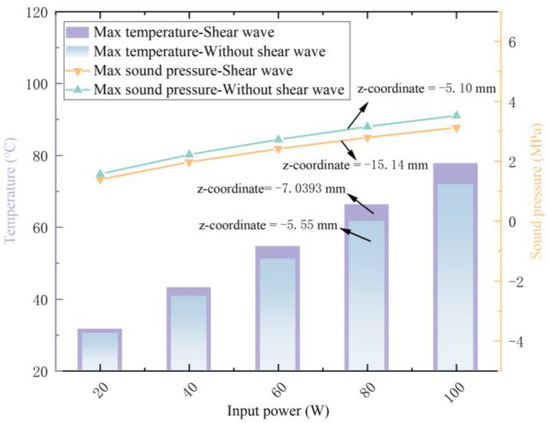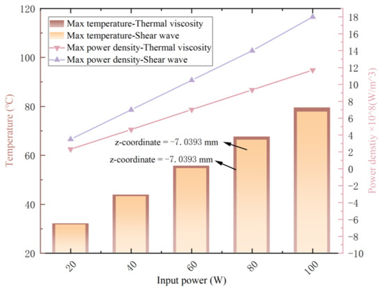 Figure 7 shows that after introducing the thermal viscosity effect, the thermal loss significantly increases, based on shear waves, and becomes more significant with the increase in power. Under thermal viscosity, the acoustic thermal effect is significantly enhanced, and the temperature is further increased. The thermal viscosity increases the friction between the media, and the heat generated by friction increases the temperature. However, at a power of 100 W, the temperature difference caused by the thermal viscosity effect is only 1.7 °C, which is not substantial compared to the significant temperature rise effect caused by shear waves. This is due to the fact that the temperature rise caused by the thermal viscosity effect is a local effect. The thermal energy in the medium is mainly concentrated in the friction and collision processes between molecules. This energy cannot effectively propagate throughout the entire medium, limiting the range and degree of thermal viscosity effect propagation within the medium. In contrast, shear waves can induce a comprehensive motion within the medium, leading to a more even heat distribution within the medium.