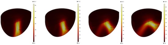 Figure 9 and Figure 10 show the tangential temperature distribution corresponding to different incident angles considering shear waves without and with the presence of the thermal viscous boundary layer, respectively. Correspondingly, temperature rise curves of different incident angles are depicted in Figure 11 and Figure 12. The results indicate that as the deflection angle θ of the transducer gradually increases, the temperature range formed at the interface between the tissue and glass on the axial section also increases, with the maximum temperature during vertical incidence exceeding 80 °C presented in Figure 11. When the deflection angle of the transducer is 15°, the temperature decreases by about 6 ° C compared to vertical incidence. When the deflection angle is 30 °C, the temperature decreases by approximately 10 °C. Thus, with the continuous increase in the deflection angle, the temperature correspondingly decreases. This trend indicates that oblique incidence enhances the shear wave effect, significantly reducing the temperature in the tissue and expanding the temperature rise range on the surface of the tissue.