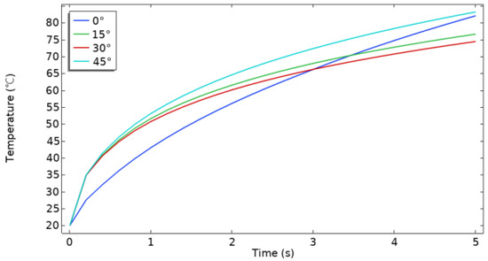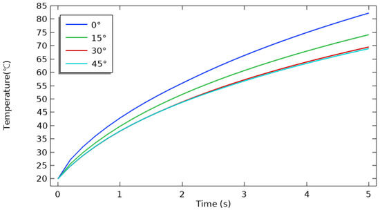 As shown in Figure 10, at the same deflection angle, the temperature on the surface of the tissue is higher due to the influence of thermal viscosity. Compared to Figure 11, there is almost no change in the maximum temperature under vertical incidence as shown in Figure 12. When thermal viscosity is not considered, the maximum temperature decreases as the deflection angle of the transducer increases. However, this linear change is no longer required, considering the thermal viscosity. Up to 3 s, the order of temperatures from high to low was 45°, 15°, 30°, and 0°. Between 3 to 3.5 s, the order shifted to 45°, 15°, 0°, and 30°. From 3.5 s to 5 s, the values from high to low were 45°, 0°, 15°, and 30°, respectively. The results indicate that the effect of the deflection angle on the temperature varies at different times and powers. When considering the thermal viscosity, 45° has the greatest impact on the temperature.