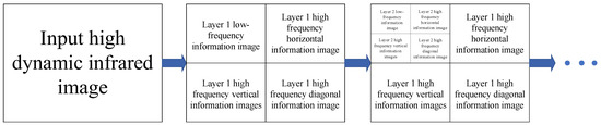 where the first part represents the low-frequency coefficients of the high dynamic infrared image, representing the background information of the image, and the second part represents the high-frequency coefficients of the high dynamic infrared image, representing the details of the image as well as the contour information. Through Formula (2), providing a multi-layer decomposition of the image, each decomposition can obtain a low-frequency component and three high-frequency components in the horizontal, vertical and diagonal directions. This decomposition structure is shown in Figure 2.