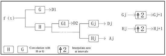 Wavelet transform is developed on the basis of Fourier transform, which retains the advantages of Fourier transform in frequency-domain processing, but also has a good time-domain processing ability. As can be seen from Equation (1), unlike the Fourier transform, which has only frequency as a variable, the wavelet transform has two variables: scale and translation . The scale controls the expansion and contraction of the wavelet function, and translation controls the translation of the wavelet function. Scale corresponds to frequency, and translation corresponds to time. This not only indicates what frequency component the signal has, but also exactly where it exists in the time domain. In 2D digital image processing, given a scale function and a wavelet function , a 2D scale function and three 2D wavelet functions , and can be combined. The discrete function can be decomposed into a linear combination of these four functions at different scales and locations, as shown in Equation (2):