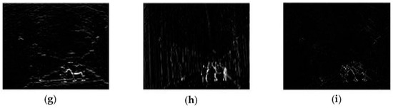 The results of the experiment involving the high-frequency information layer image are shown in Figure 5. The first layer image is shown in Figure 5a–c, and the original image is decomposed into horizontal, vertical and diagonal directions. The detailed information is not fully displayed during processing, and the subsequent enhancement effect is not obvious. The second layer image is shown in Figure 5d–f, where the image information is clearly presented. The impact of noise is small after the subsequent enhancement of the best results. The third layer of the image is shown in Figure 5g–i. The image also clearly shows detailed information; however, after subsequent processing and the amplification of the noise, as well as image synthesis, artifacts will appear, resulting in image blurring. Therefore, the algorithm in this study selected the second high-frequency information layer for subsequent processing. The experimental results of the image comparison are as follows: the experimental results of the low-frequency information layer are shown in Figure 4, and the experimental results of the high-frequency information layer are shown in Figure 5.