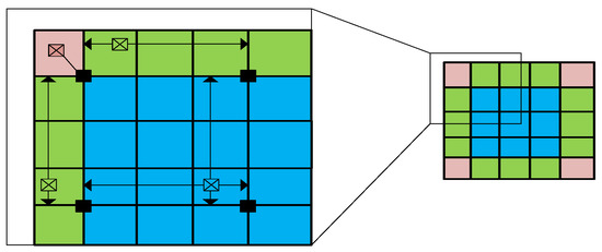 where denote the mapping function of each sub-block; denotes the pixel value of point ; and , denote the horizontal and vertical displacements, respectively. In Figure 6, A, B, C, and D denote the pixel values of the point, separately, and the o point is the pixel of the requested point. The specific application in the image is shown in Figure 7: