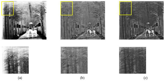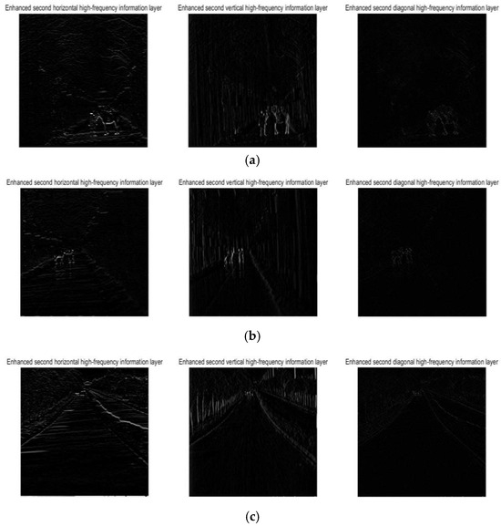 Here, represents the variance, and represents the mean. The results are shown in Figure 10 and Figure 11. Figure 10a–c present the image before processing, and Figure 11a–c present the image after enhancement. From the experimental results, the algorithm further enhances the detailed information of the image that can be shown after wavelet decomposition, and the information that is not shown can also be shown after enhancement. It is proven that the processing of the high-frequency information layer has an obvious enhancement effect, and the adopted adaptive gamma transform can effectively enhance the detail information. There is also an enhancement effect for different scenes, which shows that the method has good applicability.