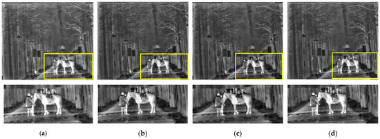 First, this study adopts different values to process infrared images for controlled experiments. Specifically, the values were set to 0.5, 1.2 and 2. The experimental results are shown in Figure 12. It can be observed from the figure that when the value is set to 0.5 and 2, as shown in Figure 12a,c, the details of the objects in the yellow box, especially the clothing stripes, become blurred, and the detail information is lost. However, after many repeated experiments, when is set to 1.2, as shown in Figure 12b, the details of the figure and the horse in the yellow box are better displayed, showing some enhancement effects. Meanwhile, this study also introduces an innovative gamma-taking formula, as shown in Figure 12d, and applies it in image processing. This innovative formula also enhances the detail information of the characters and horses in the yellow box, further confirming the applicability of the algorithm and showing the importance of adaptive for image processing.