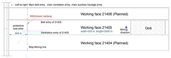 The test point was located in working face 21405 of the Hulusu coal mine. This working face was the first mining face in the fourth panel of coal seam 2-1 of the mine. Figure 1 shows the roadway layout of working face 21405. The daily progress of the working face was 5.6 to 9.6 m. The two entries were abandoned behind the longwall progress. The withdrawal roadway was arranged near the stop-mining line for the withdrawal of the production equipment after the completion of mining. A protective coal pillar with a width of 360 m was left between the withdrawal roadway of working face 21405 and the main roadway in the panel area. The value of the pillar width was greater than that of the conventional value (half the width of the working face), which facilitated the final layout of a longitudinal longwall face after all of the working faces to the right were completed.