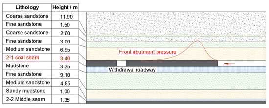 The buried depth of the working face was 650 m, and the thickness of the coal in the final mining area was 3.4 m. The cross-sectional shape of the withdrawal roadway was rectangular, with a width of 4.8 m and a height of 3.4 m. It was driven using a roadheader for high efficiency construction. In the withdrawal roadway, the roof of the coal seam was composed of medium sandstone, fine sandstone, and coarse sandstone, and the floor was composed of mudstone or sandstone. Figure 2 shows the occurrence situation of the rock strata, and Table 1 shows the mechanical parameters of the rock layer. As depicted in Figure 2, the withdrawal roadway will experience the most significant mining impact during the final mining period, that is, the working face will be continuously advanced until it connects with the withdrawal roadway. During this period, the front abutment pressure of the working face will gradually approach the withdrawal roadway, and the impact on the stability of the surrounding rock in the withdrawal roadway will become increasingly significant.