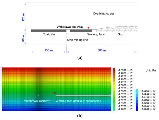 Numerical calculation model of the withdrawal roadway and the working face: (a) The spatial relationship and size of the model; (b) Numerical modeling and in situ stress field.