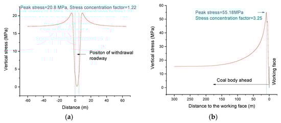 Distribution curve of abutment pressure: (a) The abutment pressure of coal mass on both sides of the withdrawal roadway; (b) Front abutment pressure of working face 21405.