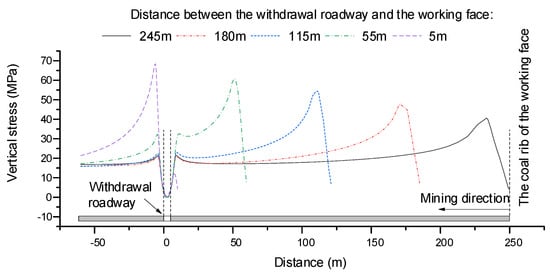 Vertical stress distribution curve at different distances between the working face and the withdrawal roadway.