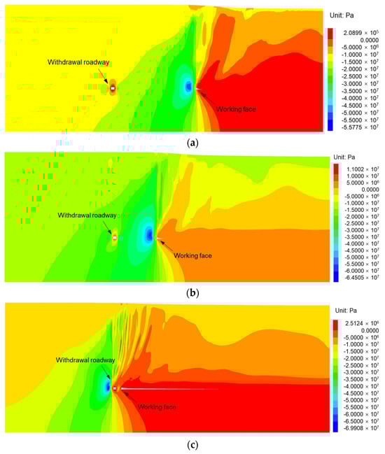 Vertical stress nephogram when the distance between the working face and the withdrawal roadway is (a) 115 m; (b) 55 m; (c) 5 m.