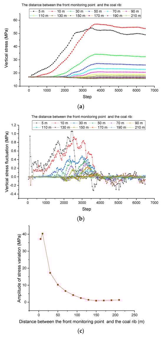 The evolution of vertical stress during mining: (a) The evolution curves of vertical stress at different measuring points in front of the working face; (b) The evolution curves of stress fluctuation value; (c) The amplitude of stress variation.