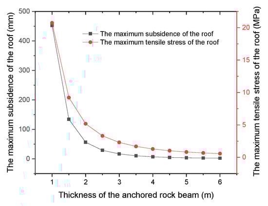 As shown in Equations (2) and (3), the thickness h of the anchored rock beam is a sensitive factor affecting the maximum subsidence and maximum tensile stress of the roof. If typical values are taken for the other parameters in the equation (q = 1.2 MPa, w = 4.8 m, E = 220 MPa, b = 1 m), then h has a significant impact on smax and σmax, as presented in Figure 8. It is obvious that the larger the h, the smaller the maximum settlement and maximum tensile stress of the roof. Therefore, increasing the thickness h of the anchored rock beam is crucial for ensuring the safety of the roadway roof. The thicker anchorage not only mitigates roof deformation, but also alleviates the tensile stress by enhancing the overall bearing capacity of the roof.